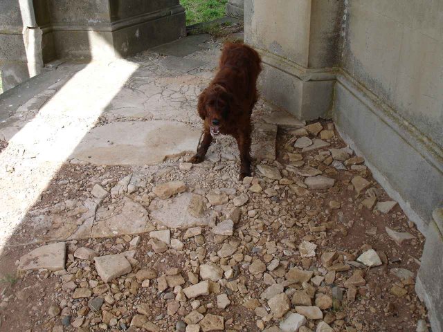 Our lovely Setter Hamera looking at the broken paving inside the perimeter.